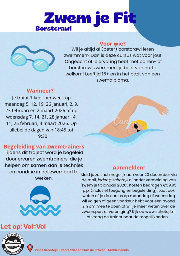 In vervolg op eerdere succesvolle ‘Zwem je fit’ activiteiten zal z.c. De Schotejil vanaf januari 2026 weer starten met een tweetal borstcrawl-cursussen. De eerste wekelijkse trainingen van deze twee parallele editie’s starten op resp. maandag 5 januari en woensdag 7 januari 2026.